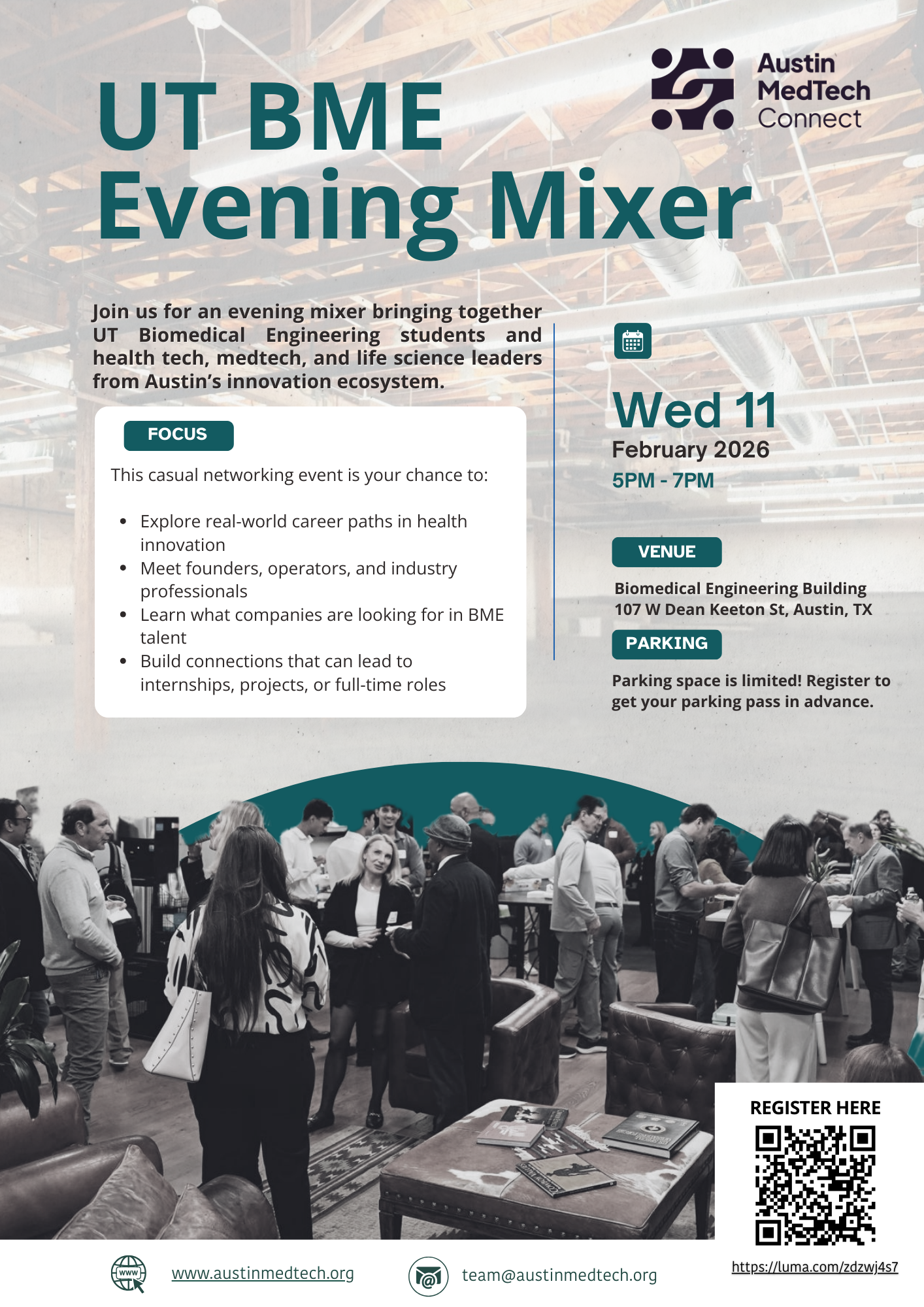 Join us for an evening mixer bringing together UT Biomedical Engineering students and health tech, medtech, and life science leaders from Austin’s innovation ecosystem.