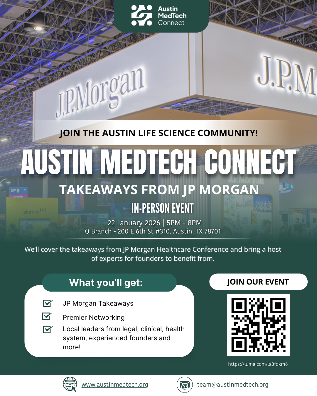 Join us for an exciting in-person event in Austin! Austin MedTech Connect is the perfect opportunity to connect with fellow founders, funders, physicians, and friends in the health tech industry. We'll cover the takeaways from the JP Morgan Healthcare conference and bring a host of experts for founders to interact with. Whether you're looking to network, share ideas, or collaborate on new projects, this event has got you covered. Mark your calendars and get ready for an unforgettable experience at Austin MedTech Connect! What you’ll get: - JP Morgan Takeaways - Premier Networking - Local leaders from legal, clinical, health system, experienced founders and more!